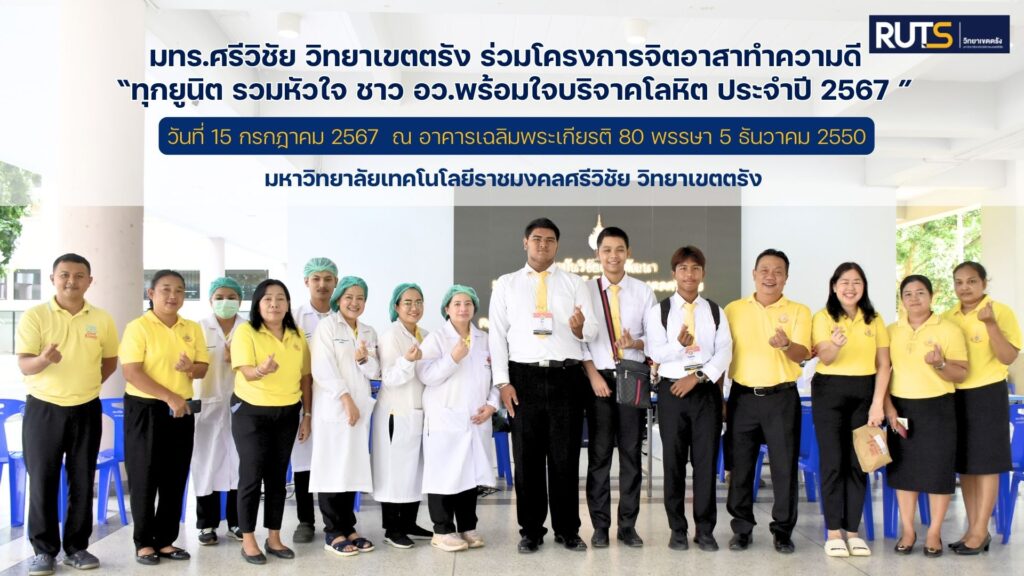 วันจันทร์ที่ 15 กรกฎาคม 2567 นำโดยผู้ช่วยศาสตราจารย์สิทธิโชค จันทร์ย่อง รองอธิการบดีประจำวิทยาเขตตรัง คณะผู้บริหาร บุคลากร และนักศึกษา มทร.ศรีวิชัย วิทยาเขตตรัง ร่วมกิจกรรมจิตอาสาทำความดี “ทุกยูนิต รวมหัวใจ ชาว อว.พร้อมใจบริจาคโลหิต ประจำปี 2567 ” เพื่อร่วมแสดงพลังความจงรักภักดี เนื่องในโอกาสพระราชพิธีมหามงคลเฉลิมพระชนมพรรษา 6 รอบ 28 กรกฎาคม 2567 ณ ลานวัฒนธรรม อาคารเฉลิมพระเกียรติ 80 พรรษาฯ