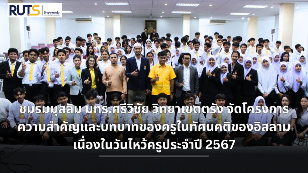 วันที่ 15 สิงหาคม 2567 เวลา 08.30 น. ชมรมมุสลิม มทร.ศรีวิชัย วิทยาเขตตรัง จัดโครงการความสำคัญและบทบาทของครูในทัศนคติของอิสลาม เนื่องในวันครูแห่งชาติ ประจำปี 2567 ณ ห้องประชุมอาคารเรียนรวมและปฏิบัติการ โดยมี ผู้ช่วยศาสตราจารย์มาโนช ขำเจริญ คณบดีคณะวิทยาศาสตร์และเทคโนโลยีการประมง อาจารย์ขวัญชีวา หยงสตาร์ รองคณบดีฝ่ายพัฒนานักศึกษา คณะวิศวกรรมศาสตร์และเทคโนโลยี พร้อมด้วย ผู้บริหาร คณาจารย์ บุคลากรและนักศึกษาในศาสนามุสลิม จากทั้งสามสังกัด ได้แก่ คณะวิทยาศาสตร์และเทคโนโลยีการประมง คณะวิศวกรรมศาสตร์และเทคโนโลยี และวิทยาลัยการโรงแรมและการท่องเที่ยว เข้าร่วมโครงการในครั้งนี้ โดยมีนายศรัณยู อุมา ครูสอนศาสนาอิสลาม โรงเรียนสิเกาประชาผดุงวิทย์ อ.สิเกา จ.ตรัง ได้บรรยายในหัวข้อ “ความสำคัญและบทบาทของครูในทัศนคติของอิสลาม” ให้ โอวาทในทางศาสนาอิสลาม เกี่ยวกับการเคารพครูบาอาจารย์ กับนักศึกษามุสลิม ส่งเสริมทัศนคติเกี่ยวกับการเคารพครูบาอาจารย์เพื่อให้นักศึกษามุสลิมเชื่อมความสัมพันธ์ต่อกัน แสดงออกในทางที่ถูกต้อง นักศึกษามีความเข้าใจ ความสำคัญและบทบาทของครูในทัศนคติของอิสลาม