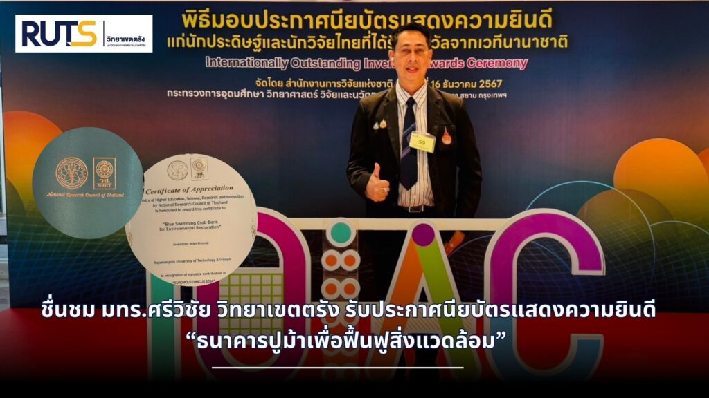ผศ.ดร.วิกิจ ผินรับ ผู้ช่วยอธิการบดีประจำวิทยาเขตตรัง และหัวหน้าโครงการธนาคารปูม้าตรังกระบี่ อาจารย์ประจำคณะวิทยาศาสตร์การประมง มหาวิทยาลัยเทคโนโลยีราชมงคลศรีวิชัย วิทยาเขตตรัง ได้รับมอบประกาศนียบัตรแสดงความยินดี ในผลงานเรื่อง “ธนาคารปูม้าเพื่อฟื้นฟูสิ่งแวดล้อม” ซึ่งได้รับรางวัลจากเวทีนานาชาติ ในการนำเสนอผลงานนวัตกรรมใหม่ ซึ่งได้รับรางวัลเหรียญทอง (GOLD MEDAL) และรางวัลพิเศษระดับดีเยี่ยมอีก 2 รางวัล (EXCELLENCE) จากการเข้าร่วม นำเสนอผลงาน ที่กรุงบูคาเรสต์ ” EURO POLITEHNICUS 2024″ เมื่อวันที่ 22-24 พฤศจิกายน 2567 ที่ผ่านมา โดยสำนักงานวิจัยแห่งชาติ (วช.) เป็นผู้เสนอชื่อเข้าร่วมงานดังกล่าว ภายใต้ชื่อผลงานธนาคารปูม้าเพื่อฟื้นฟูสิ่งแวดล้อม ( Blue Swimming Crab Bank for Environmental Restoration)