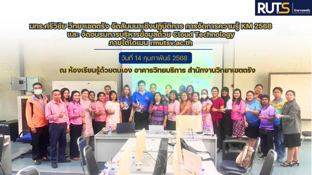 วันที่ 14 กุมภาพันธ์ 2568 สำนักงานวิทยาเขตตรัง ร่วมกับ สำนักวิทยบริการและเทคโนโลยีสารสนเทศ จัดประชุมสัมมนาเชิงปฏิบัติการ การจัดการความรู้ KM 2568 และ อบรมบุคลากรสำนักงานวิทยาเขตตรัง ในหัวข้อ การบริหารข้อมูลด้วย Cloud Technology ภายใต้โดเมน rmutsv.ac.th ณ ห้องเรียนรู้ด้วยตนเอง อาคารวิทยบริการ สำนักงานวิทยาเขตตรัง ซึ่งการอบรมดังกล่าวได้รับเกียรติจาก นายภานุวัฒน์ หนูนคง และ นางสาวจันทิมา จันจำปา ร่วมเป็นวิทยากรถ่ายทอดองค์ความรู้เกี่ยวกับการจัดสรรการให้บริการพื้นที่จัดเก็บข้อมูลบน Google Workspace , Microsoft 365 Education และการประยุกต์Microsoft Team เข้ากับการปฏิบัติงาน อาทิเช่น การประชุมออนไลน์ การดาวน์โหลดเอกสารและการจัดเก็บข้อมูลเป็นหมวดหมู่ การแบ่งกลุ่มงาน ซึ่งสามารถแจ้งเตือนและติดตามงานที่ได้รับมอบหมายได้ การอบรมในครั้งนี้ทำให้บุคลากรสำนักงานวิทยาเขตตรัง สามารถจัดเก็บข้อมูลบนGoogle Workspace และ Microsoft 365 Education ซึ่งมีพื้นที่จัดเก็บข้อมูลฟรี มีความปลอดภัย สามารถดำเนินงานด้านต่างๆได้สะดวกและรวดเร็วมากยิ่งขึ้น