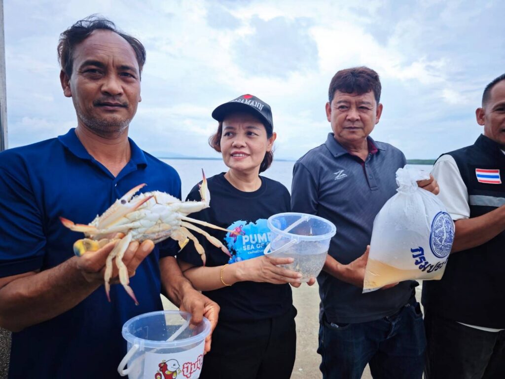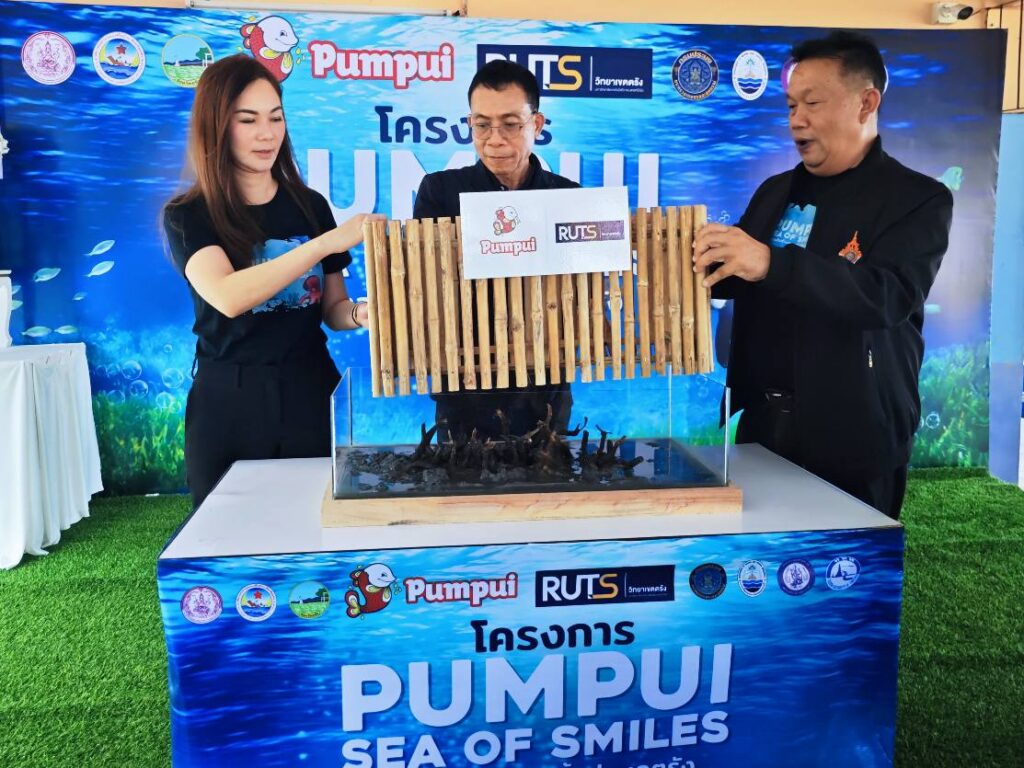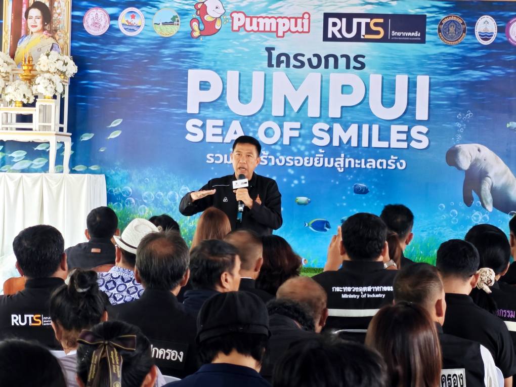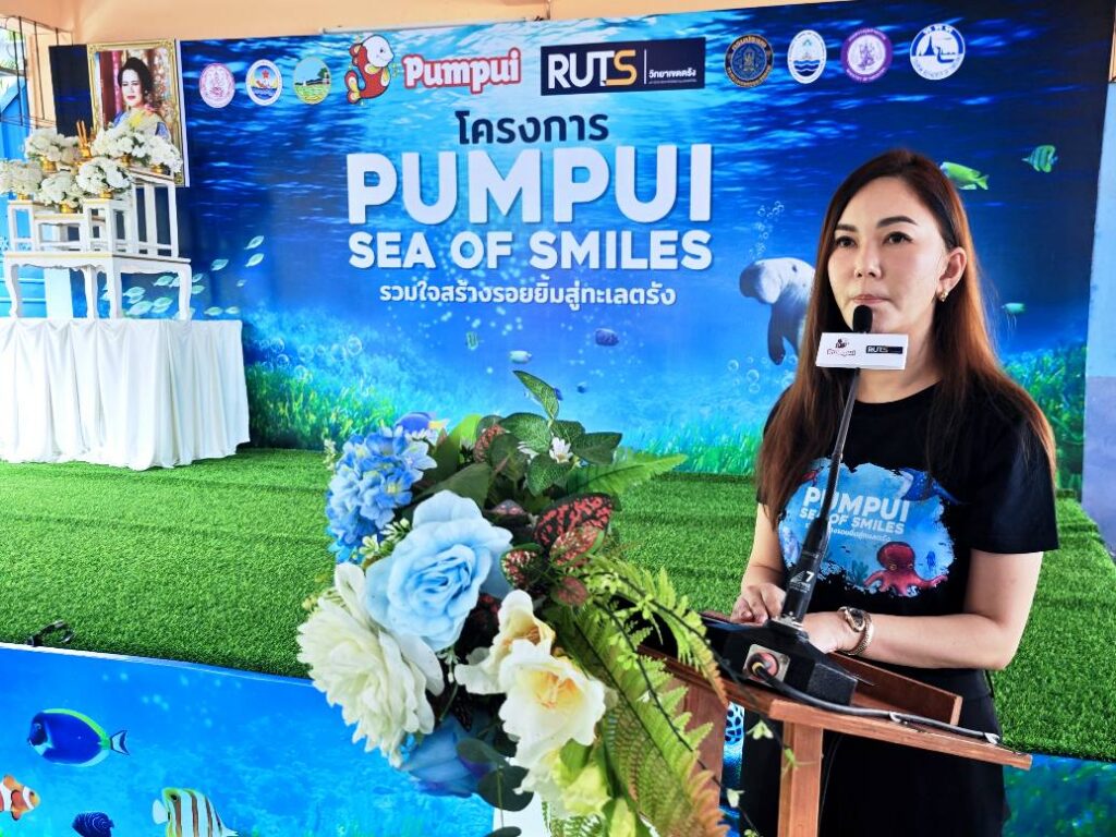 จากนั้น คุณปวิตา โตทับเที่ยง ประธานเจ้าหน้าที่บริหารสายงานความยั่งยืนและสื่อสารองค์กร บริษัท ผลิตภัณฑ์อาหารกว้างไพศาล จำกัด (มหาชน) กล่าวว่า โครง “PUMPUI SEA of SMILES – รวมใจสร้างรอยยิ้มสูทะเลตรัง”มีเป้าหมายเพื่อสร้างความตระหนักรู้ด้านการอนุรักษ์ทรัพยากรทางทะเลและชายฝั่ง พร้อมพัฒนา “แหล่งเรียนรู้ต้นแบบสิ่งแวดล้อม” และส่งเสริมความร่วมมือระหว่างภาคเอกชน ภาครัฐ สถาบันการศึกษา และชุมชน เพื่อฟื้นฟูทะเลตรังให้คงความอุดมสมบูรณ์อย่างยั่งยืน ได้จัดให้มีกิจกรรมปล่อยพันธุ์กุ้งแชบ๊วยจำนวน 100,000 ตัว ปล่อยแม่ปูม้ามีไข่จำนวน 50 ตัว เพื่อเพิ่มการขยายพันธุ์ในธรรมชาติ มอบอุปกรณ์การเรียนให้เยาวชนในพื้นที่ และการบรรยายความรู้ด้านการอนุรักษ์ทรัพยากรทางทะเล โดย อาจารย์ และคณะทำงาน นักวิจัย จากคณะวิทยาศาสตร์และเทคโนโลยีการประมง มหาวิทยาลัยเทคโนโลยี ราชมงคลศรีวิชัย วิทยาเขตตรัง พร้อมชี้แจงผลการวิจัยเบื้องต้น พบว่าการฟื้นฟูแหล่งหญ้าทะเลในเขตกั้นคอกฟื้นตัวเพิ่มขึ้นกว่า 70% ภายในระยะเวลาไม่กี่เดือน โดยแบ่งการวิจัยการกั้นคอกหญ้าทะเล ออกเป็น 2 รูปแบบ คือรูปทรงสี่เหลี่ยม และรูปวงกลม ทั้งนี้ ทีมวิจัย ของมหาวิทยาลัย ได้อยู่ในระหว่างการศึกษาว่ารูปแบบใดช่วยลดการตกตะกอนของโคลน และส่งเสริมการเจริญเติบโตของหญ้าทะเลได้ดีที่สุด เพื่อใช้เป็นแนวทางฟื้นฟูระบบนิเวศทางทะเลตรังในระยะยาวได้ต่อไป ซึ่งการมีส่วนร่วมในการดำเนินโครงการในครั้งนี้ เป็นการแสดงให้เห็นถึงการร่วมกันผนึกกำลังจากทุกภาคส่วน เพื่อการฟื้นฟูและอนุรักษ์ระบบนิเวศหญ้าทะเลบริเวณชายฝั่งจังหวัดตรัง ตลอดจนส่งเสริมการเรียนรู้และปลูกจิตสำนึกด้านการอนุรักษ์ทรัพยากรทางทะเลให้แก่เยาวชน นักศึกษา และชุมชนชายฝั่ง