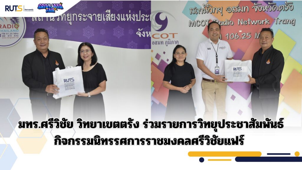 เมื่อวันพุธที่ 19 พฤศจิกายน 2568 มหาวิทยาลัยเทคโนโลยีราชมงคลศรีวิชัย วิทยาเขตตรัง นำโดย ผู้ช่วยศาสตราจารย์สิทธิโชค จันทร์ย่อง รองอธิการบดีประจำวิทยาเขตตรัง เข้าร่วมสัมภาษณ์สดผ่าน 2 รายการวิทยุชื่อดังในจังหวัดตรัง เพื่อประชาสัมพันธ์กิจกรรมนิทรรศการราชมงคลศรีวิชัยแฟร์ ที่กำลังจะจัดในรูปแบบOnline วันที่ 24-28 พ.ย. 2568 และรูปแบบOnsite วันที่ 27-28 พ.ย. 2568 มี่ มทร.ศรีวิชัย วิทยาเขตตรัง เพื่อถ่ายทอดบทบาทของสถาบันในการพัฒนาชุมชนและสร้างโอกาสทางการศึกษาให้กับประชาชนในพื้นที่