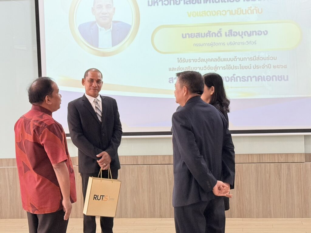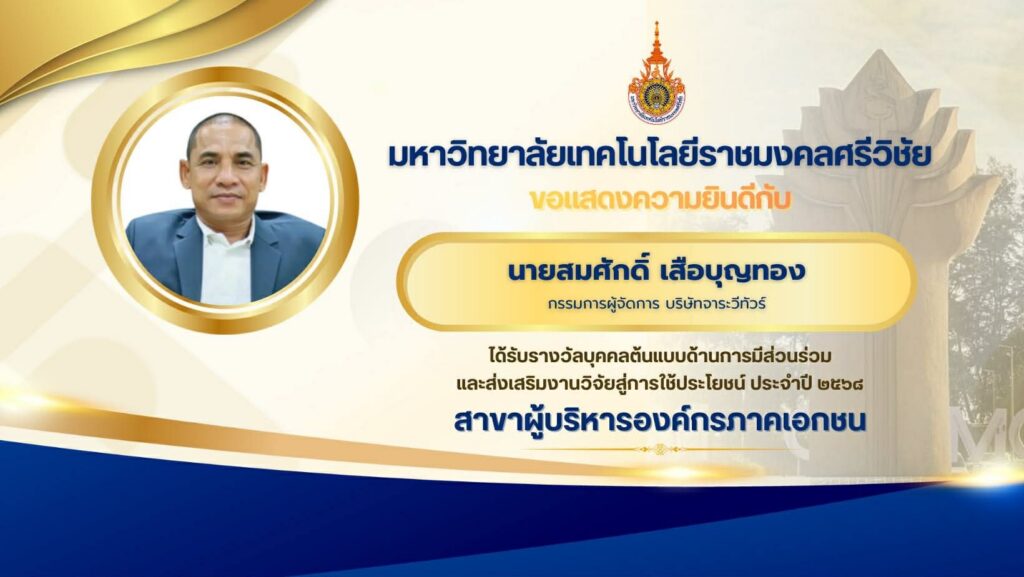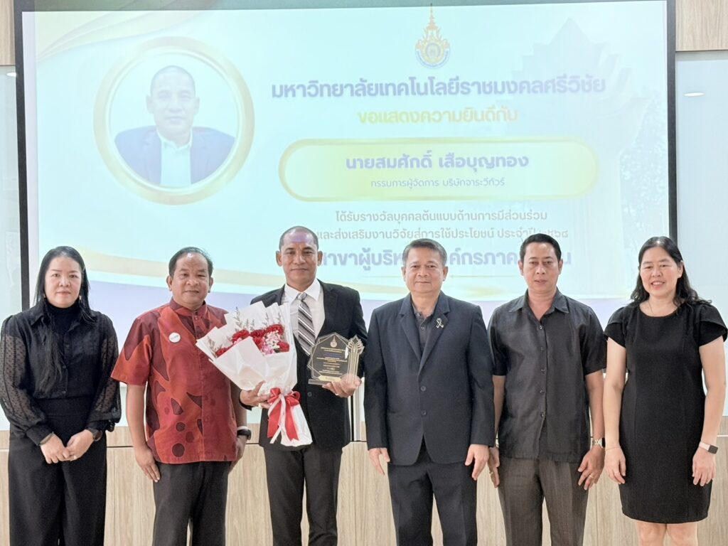 ในวันนี้ 29 มกราคม 2569 ที่ สถาบันวิจัยและพัฒนา อาคารเฉลิมพระเกียรติ ฯ มทร.ศรีวิชัย วิทยาเขตตรัง ศาสตราจารย์ ดร.สุวัจน์ ธัญรส อธิการบดีมหาวิทยาลัยเทคโนโลยีราชมงคลศรีวิชัย ได้มอบรางวัลบุคคลต้นแบบด้านการมีส่วนร่วมและส่งเสริมงานวิจัยสู่การใช้ประโยชน์ ประจำปี 2568 สาขาผู้บริหารองค์กรภาคเอกชน ให้แก่ นายสมศักดิ์ เสือบุญทอง กรรมการผู้จัดการ บริษัทจาระวีทัวร์ โดยมีคณะผู้บริหาร และบุคลากรมหาวิทยาลัยเทคโนโลยีราชมงคลศรีวิชัย ร่วมแสดงความยินดี เพื่อเป็นการเชิดชูเกียรติและสร้างขวัญกำลังใจแก่ผู้ที่มีบทบาทสำคัญในการส่งเสริม สนับสนุน และผลักดันงานวิจัยของมหาวิทยาลัยให้สามารถนำไปใช้ประโยชน์ได้อย่างเป็นรูปธรรม อันจะนำไปสู่การพัฒนาสังคม ชุมชน และประเทศชาติอย่างยั่งยืน