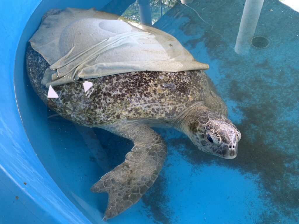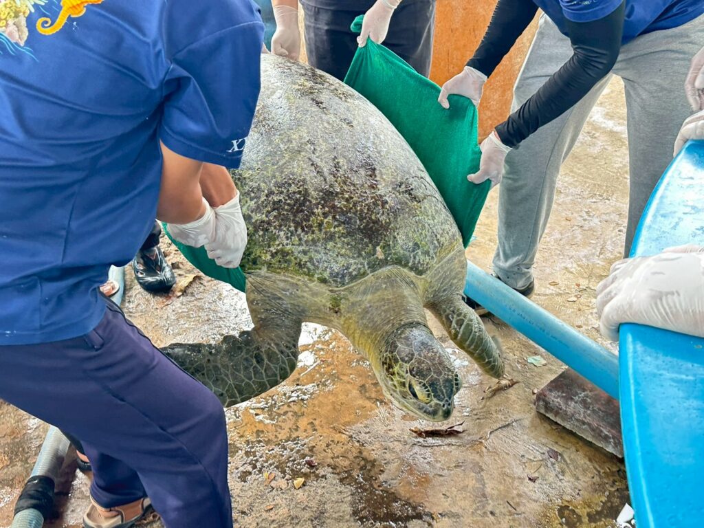 จากการตรวจประเมินเบื้องต้นพบว่าเป็นเต่าตนุ (Chelonia mydas) ความยาวกระดอง 108 เซนติเมตร กว้าง 101 เซนติเมตร อยู่ในช่วงวัยโตเต็มวัย เพศเมีย สภาพร่างกายโดยรวมสมบูรณ์ ไม่พบแถบโลหะระบุตัวตน ภายนอกพบเพรียงเกาะบริเวณรยางค์บางส่วน และมีตะไคร่น้ำเกาะกระดองเล็กน้อย ไม่พบบาดแผลฉกรรจ์หรือร่องรอยการติดเครื่องมือประมง เต่ายังคงตอบสนองได้ดี สามารถว่ายน้ำ กินอาหาร และยกหัวหายใจได้ตามปกติ แต่มีอาการลอยตัว ไม่สามารถดำน้ำได้ตามธรรมชาติ