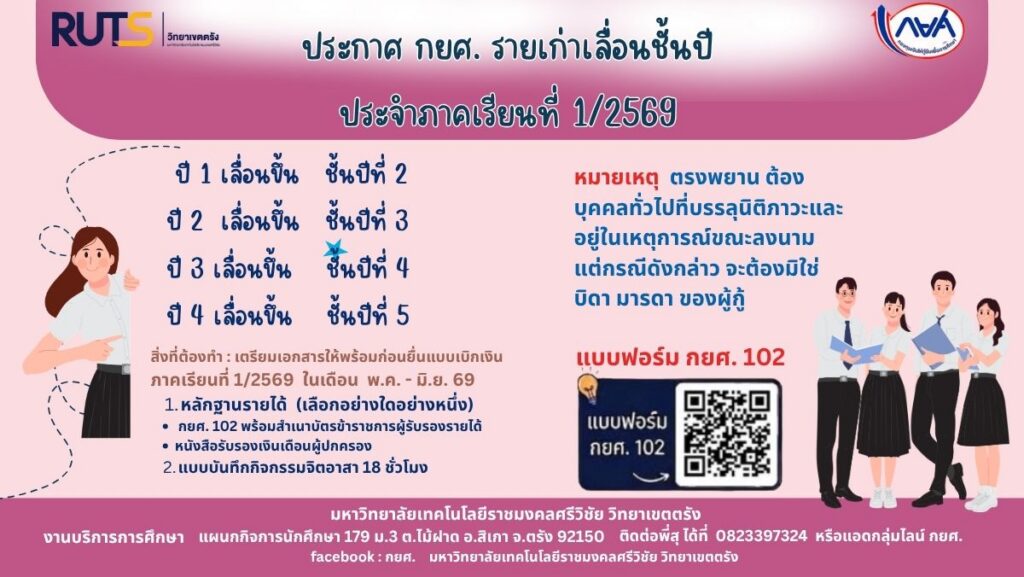ติดตามข่าวสาร : Facebook : กยศ. มหาวิทยาลัยเทคโนโลยีราชมงคลศรีวิชัย วิทยาเขตตรัง