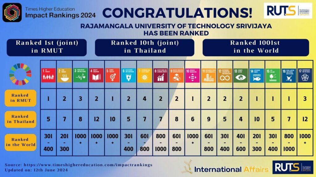 Rajamangala University of Technology Srivijaya has been ranked 1st (joint) in RMUT, ranked 10th(joint) in Thailand and 1001st in the world, also RUTS has been overall ranked 1001st in the World, including 4 SDGs composed of