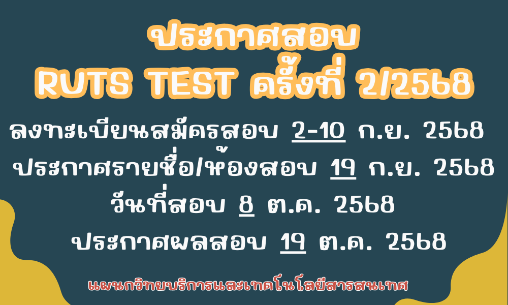 1. RUTS TEST คือเกณฑ์มาตรฐานความสามารถด้านภาษาอังกฤษของนักศึกษาระดับปริญญาตรีก่อน สำเร็จการศึกษา มีกำหนดการสอบ 4 ครั้ง ต่อปีการศึกษา (ตามปฏิทินที่แจ้งประกาศ)